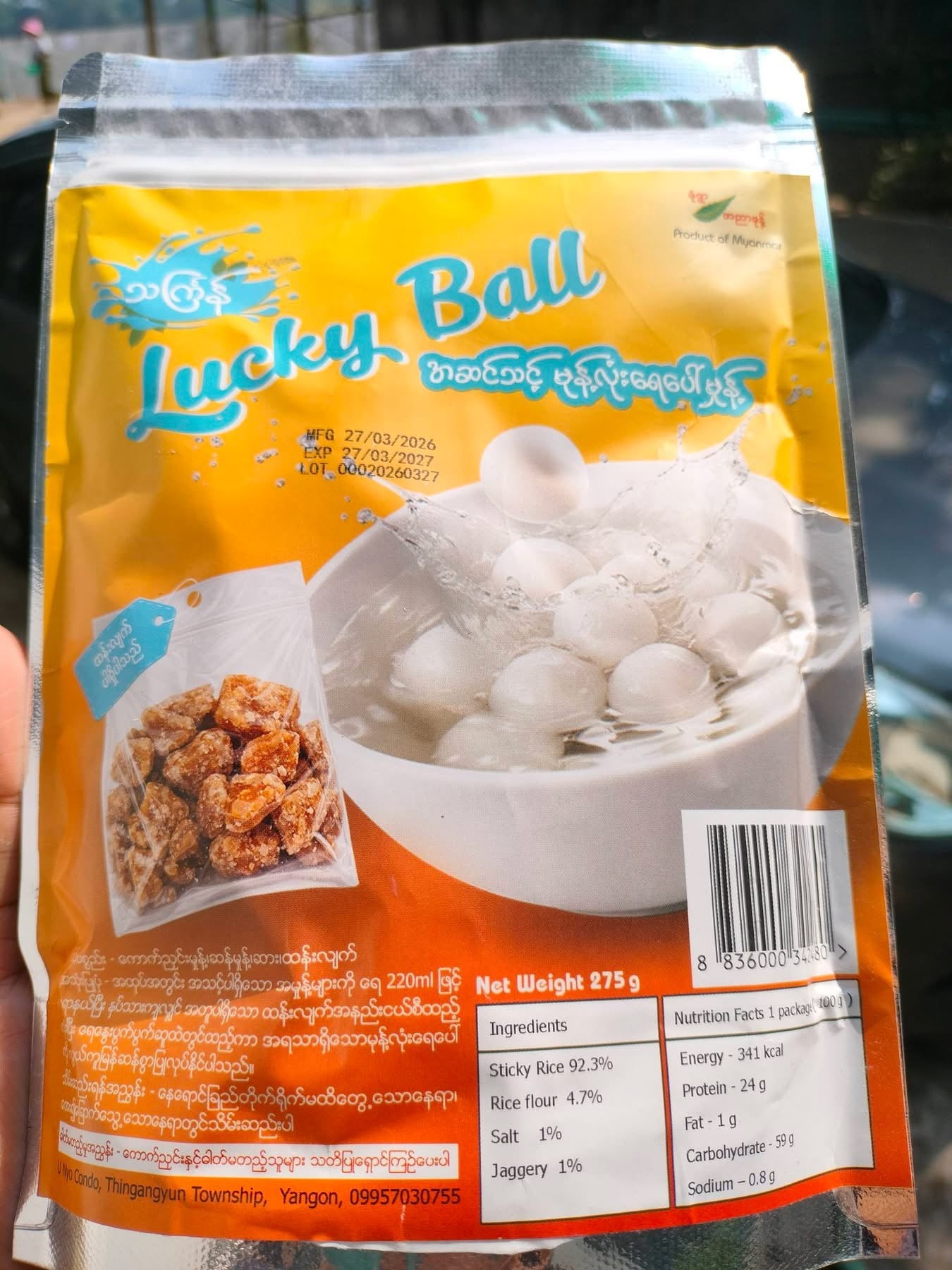 မုံရွာအညာမုန့်ရဲ့ Lucky Ball (အဆင်သင့်မုန့်လုံးရေပေါ်) အထုပ်လေးကို အိမ်မှာ လုပ်စားမယ်ဆိုရင် တစ်ခြားဘာအမှုန့်မှထပ်ရောထည့်စရာ မလိုတော့ဘူးနော်… ထန်းလျက်မရှိလို့လဲ အပြေးဝယ်စရာမလိုအောင် အထုပ်ထဲမှာ ထန်းလျက်ပါ ထည့်ပေးပြီးသားပါရှင့်.